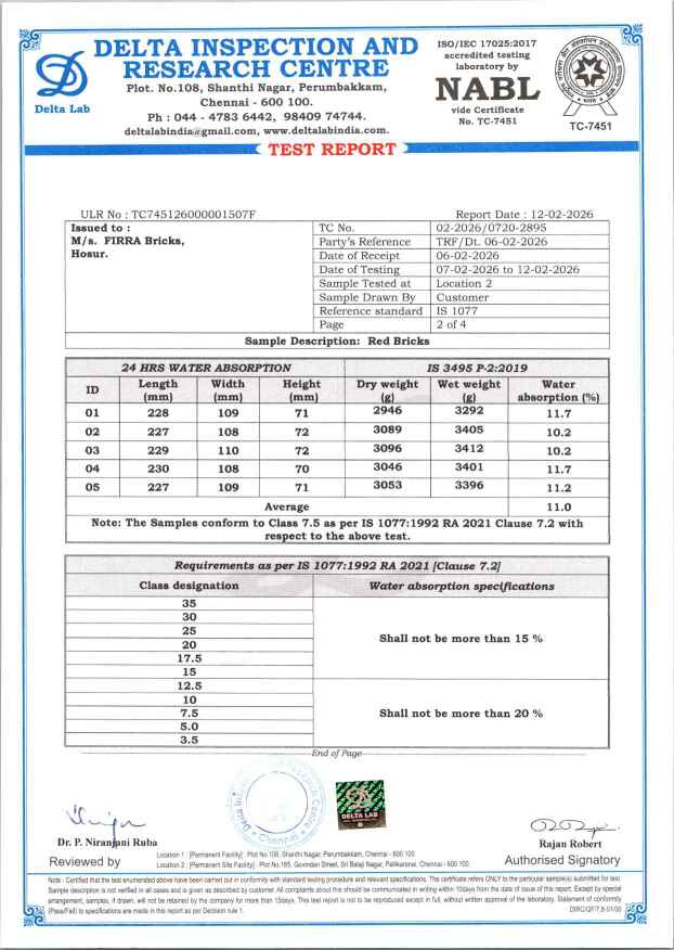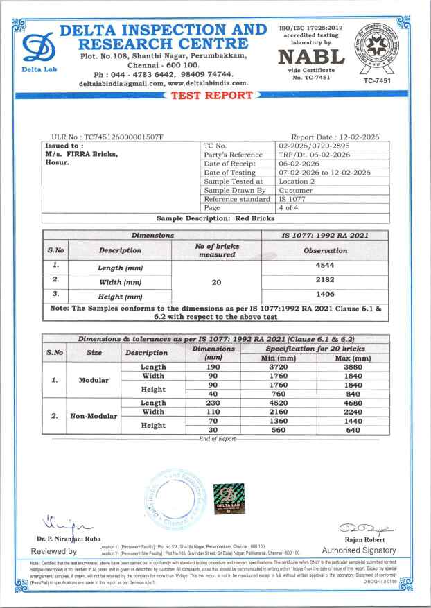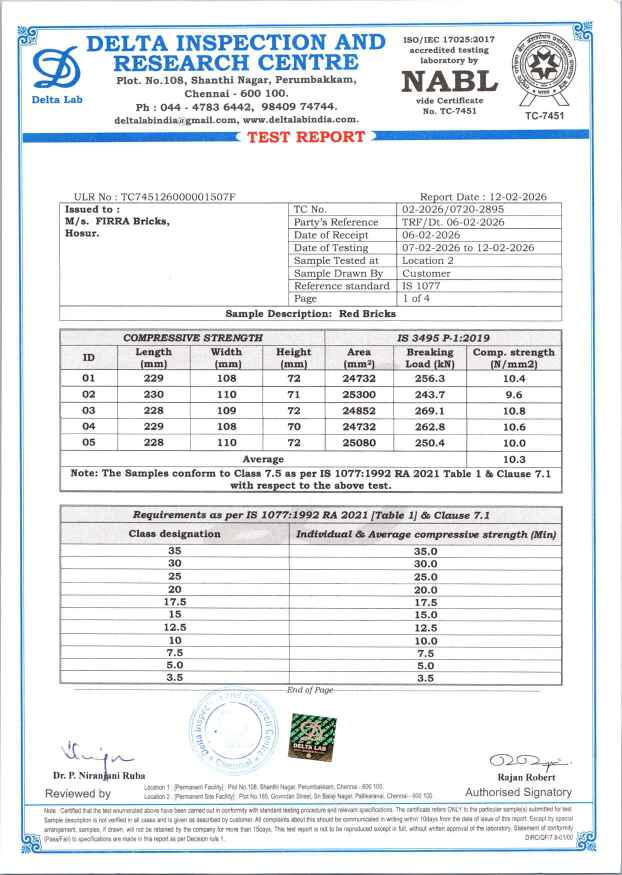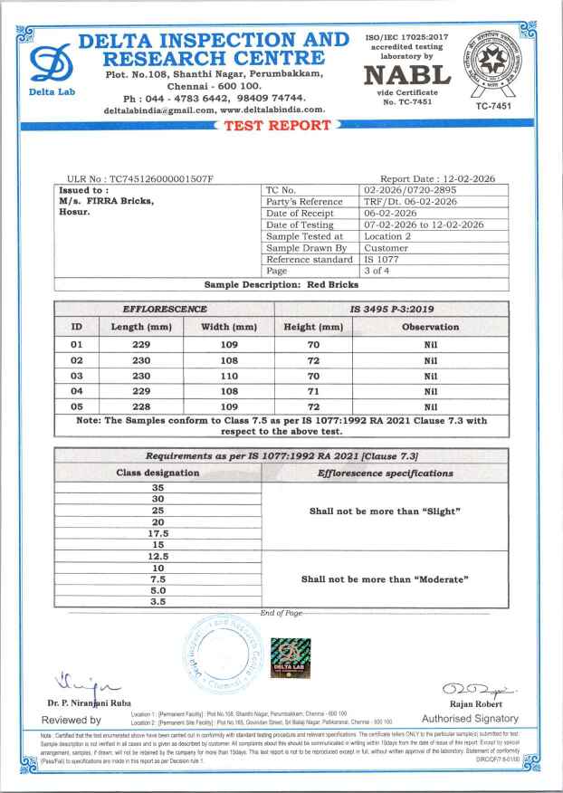 Firra wirecut bricks are tested and verified through standard quality checks including compressive strength, water absorption, efflorescence, dimensional accuracy, and IS 1077 compliance. These certifications ensure that every batch meets the quality benchmarks required for premium and safe construction.